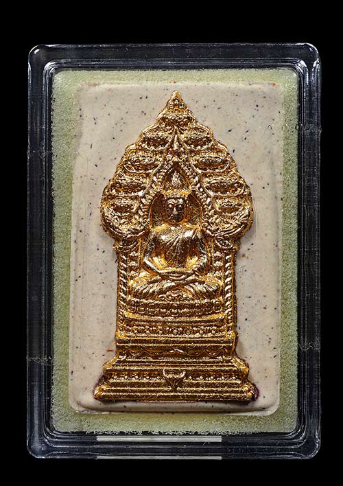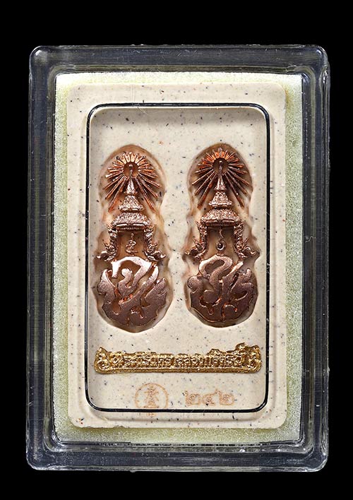 พระนิรันตรายสองกษัตริย์ มหาพุทธานุภาพแห่งแผ่นดิน เนื้อผง (สีครีม) หน้าปัดทอง หลังฝังนวะโลหะชุบนาก (พระปรมาภิไธยย่อสองกษัตริย์) ขนาดสูง 3.2 เซน ปี2552 เลขสวย 242 พร้อมกล่องเดิมครับ