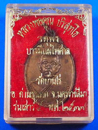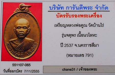 เหรียญหลวงพ่อคูณวัดบ้านไร่ จ.นครราชสีมา รุ่นเสาร์ 5 จตุพรบารมีแผ่ไพศาล ปี 2537 เนื้อนวะโลหะ หมายเลข 791 พร้อมกล่องเดิม และบัตรรับรองสถาบันการันตีพระ