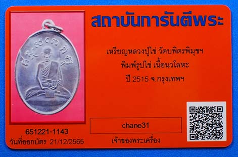 เหรียญหลวงปู่ไข่ วัดบพิตรพิมุข พิมพ์รูปไข่ เนื้อนวะโลหะ ปี 2515 จ.กรุงเทพ พร้อมกล่องเดิม และบัตรรับรองสถาบันการันตีพระ รับประกันตามกฎ G พระ ทุกประการครับ