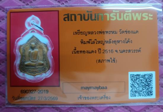 เหรียญหลวงพ่อพรหม พิมพ์โล่ใหญ่หลังอุหางโค้ง ปี 2516 สภาพใช้ พร้อมบัตรรับรอง