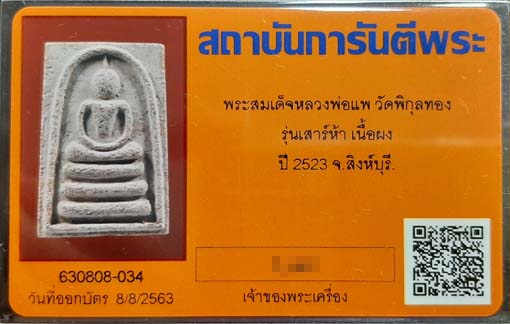 พระสมเด็จเสาร์ห้า หลวงพ่อแพ ปี2523 เนื้อผง วัดพิกุลทอง จ.สิงห์บุรี พร้อมบัตรรับรองครับ |