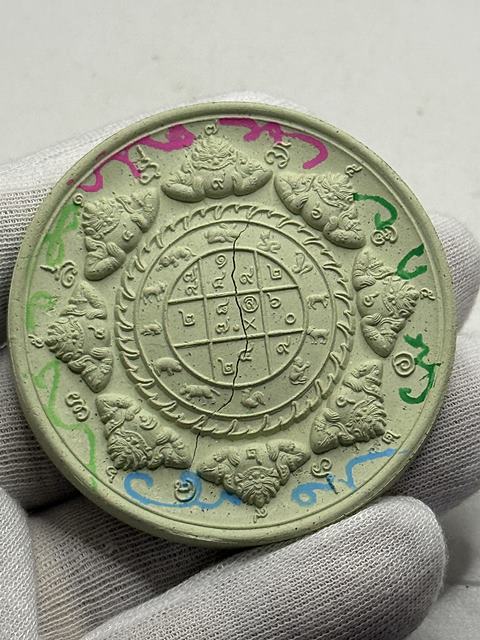 พระผงสุริยัน-จันทรา ดวงตราเทวฤทธิ์ เนื้อผงสีเขียว หน้ากากทองแดง สร้าง 1,000 องค์ รุ่นมรดกพ่อ วัดพุทไธศวรรย์ ปี2547 มีกล่อง |