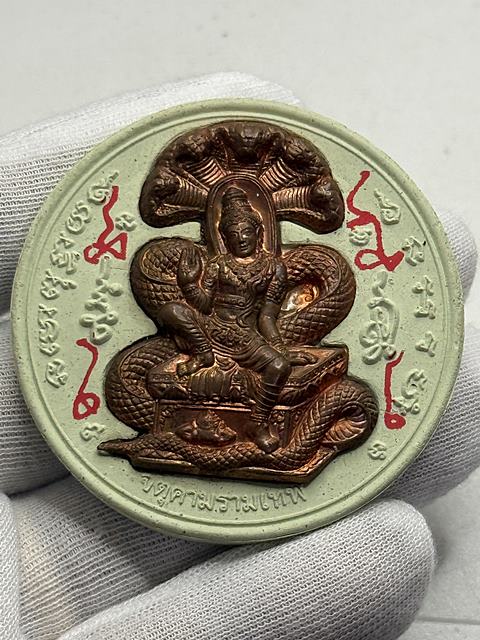พระผงสุริยัน-จันทรา ดวงตราเทวฤทธิ์ เนื้อผงสีเขียว หน้ากากทองแดง สร้าง 1,000 องค์ รุ่นมรดกพ่อ วัดพุทไธศวรรย์ ปี2547 มีกล่อง