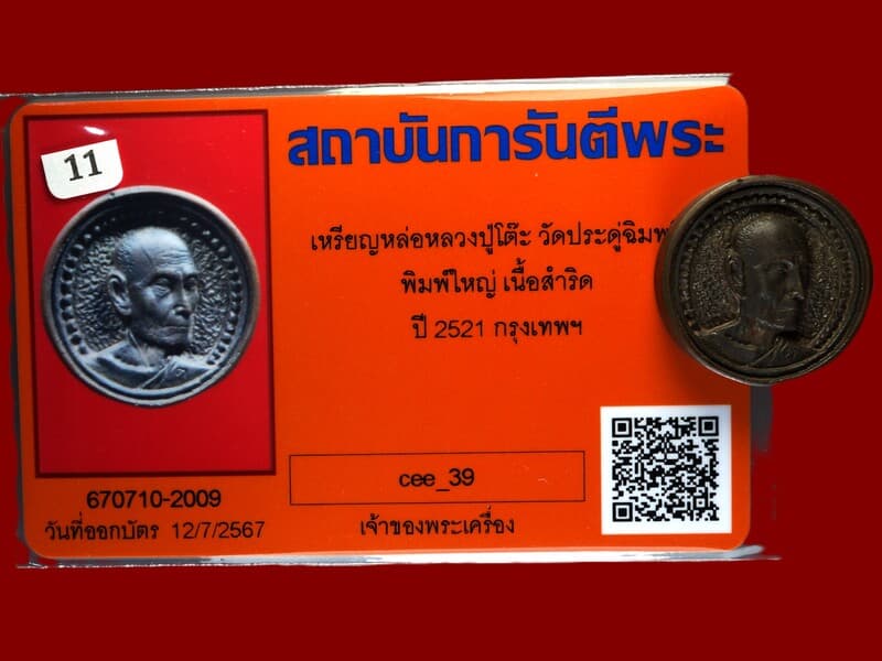 เหรียญหล่อล้อแม็กซ์ พิมพ์ใหญ่ เนื้อสำริด หลวงปู่โต๊ะ วัดประดู่ฉิมพลี กทม. ปี 2521 พร้อมบัตร G-Pra
