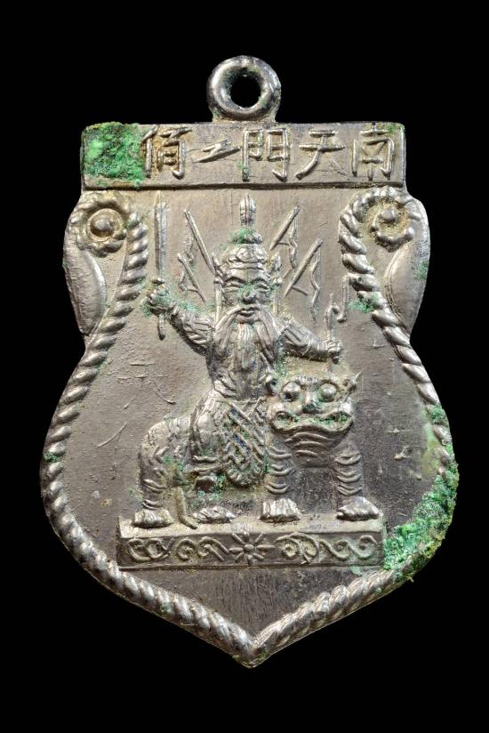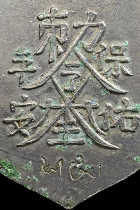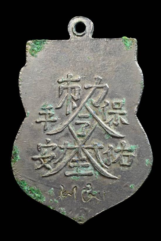 เหรียญเสมาเจ้าพ่อเสือ ด้านหลังยันต์ (ศาลเจ้าพ่อเสือ) ตอกโค๊ดภาษาจีน เสาชิงช้า กรุงเทพฯ