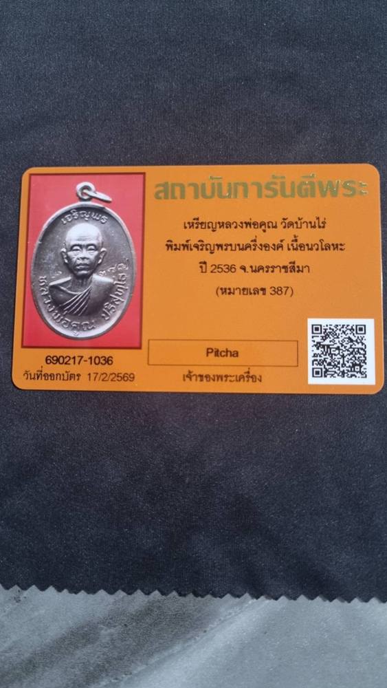 หลวงพ่อคูณปี 2536 รุ่นเจริญพรบนเนื้อนวะ จำนวนการสร้าง 999เหรียญ เลข387