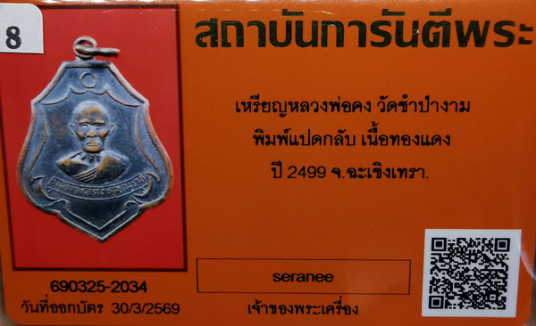 เหรียญหลวงพ่อคง วัดซำป่าง่าม พิมพ์แปดกลับ เนื้อทองแดง ห่วงเดิม(หลังมีจาร) ปี2499 จ.ฉะเชิงเทรา + บัตรG-pra สภาพเดิมค่ะ สภาพตามรูปทุกประการค่ะ