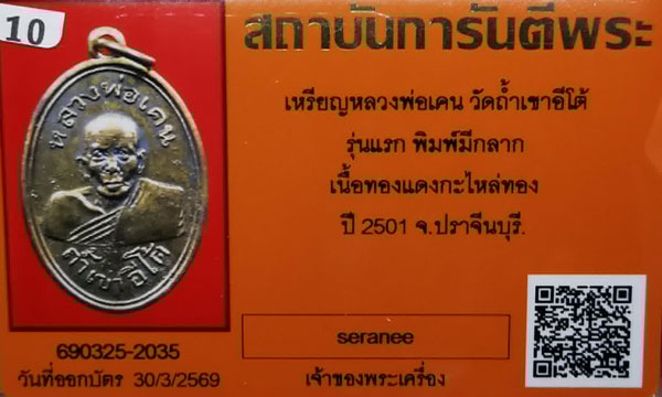 เหรียญหลวงพ่อเคน วัดถ้ำเขาอีโต้ รุ่นแรก พิมพ์มีกลาก เนื้อทองแดงกะไหล่ทอง ห่วงเดิม ปี2501 จ.ปราจีนบุรี + บัตรG-pra สภาพเดิมค่ะ สภาพตามรูปทุกประการค่ะ