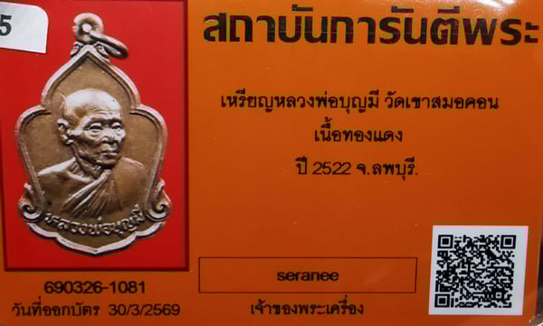 เหรียญพ่อบุญมี วัดเขาสมอคอน เนื้อทองแดง ห่วงเดิม ปี2522 จ.ลพบุรี + บัตรG-pra สภาพเดิมค่ะ