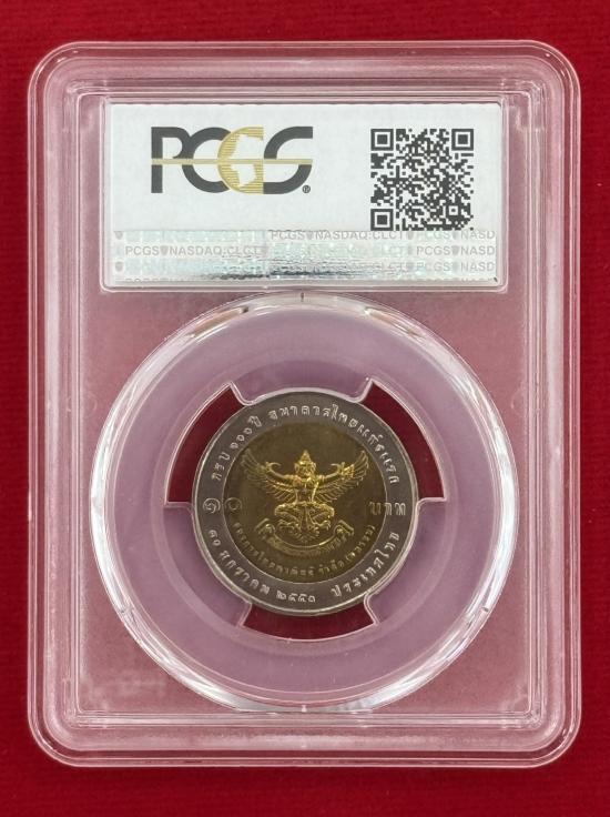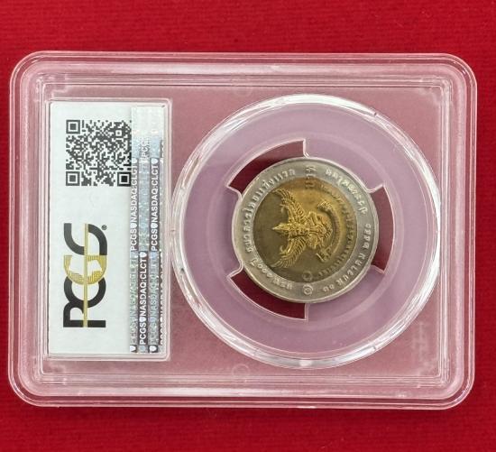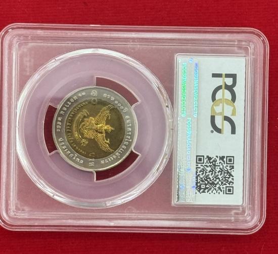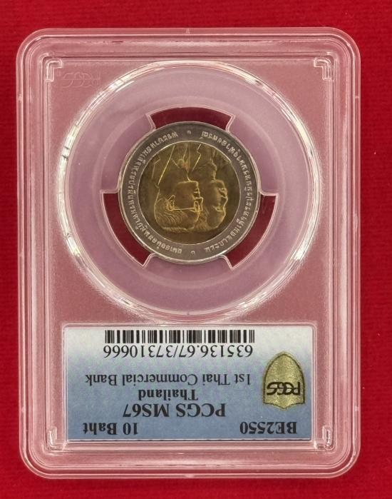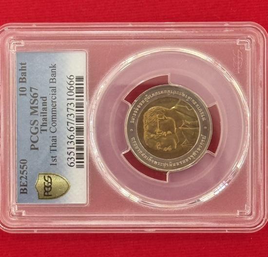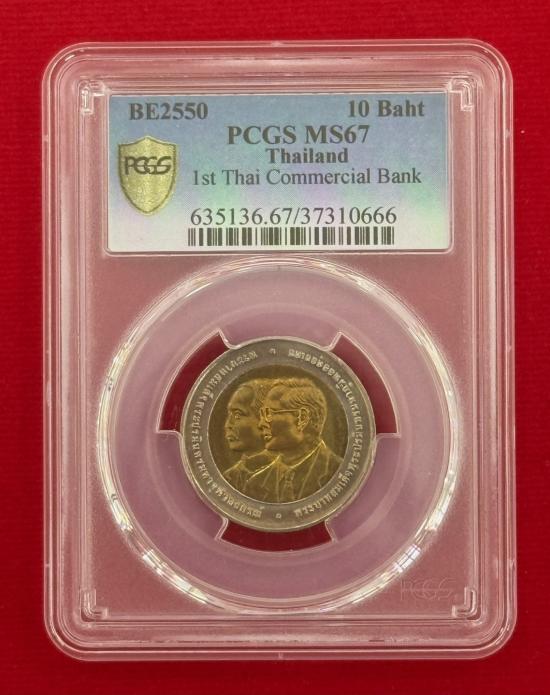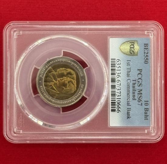 เหรียญเกรด PCGS MS 67 เหรียญ 10 บาท พระบาทสมเด็จพระปรมินทรมหาภูมิพลอดุยเดช พระบาทสมเด็จพระปรมินทรมหาจุฬาลงกรณ์ ครบ 100 ปี ธนาคารไทยแห่งแรก 10 มกราคม 2550 ประเทศไทย สภาพสวยตามรูป