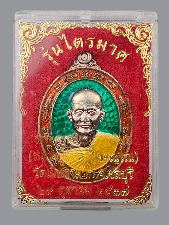 +++...เหรียญไตรมาส เนื้อเงินลงยา หลวงปู่ม่น วัดเนินตามาก จ.ชลบุรี กล่องเดิม พระบ้านเก็บเก่า เคาะเดียวแดง...+++ |