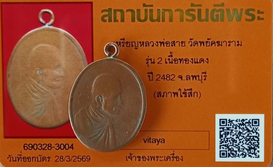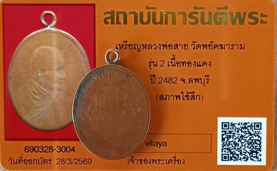 เคาะเดียวแดง+++เหรียญหลวงพ่อสาย วัดพยัคฆาราม ปี2482 รุ่น2 แท้ดูง่ายๆ สวยๆหลักแสนครับ เหรียญหลักเมืองลพบุรี มาพร้อมบัตรจีพระแท้สภาพใช้สึก