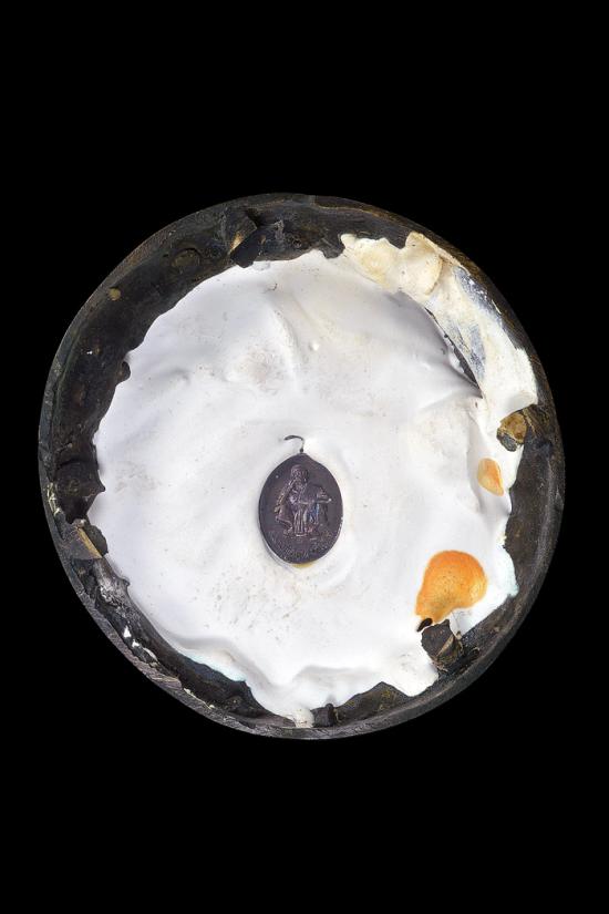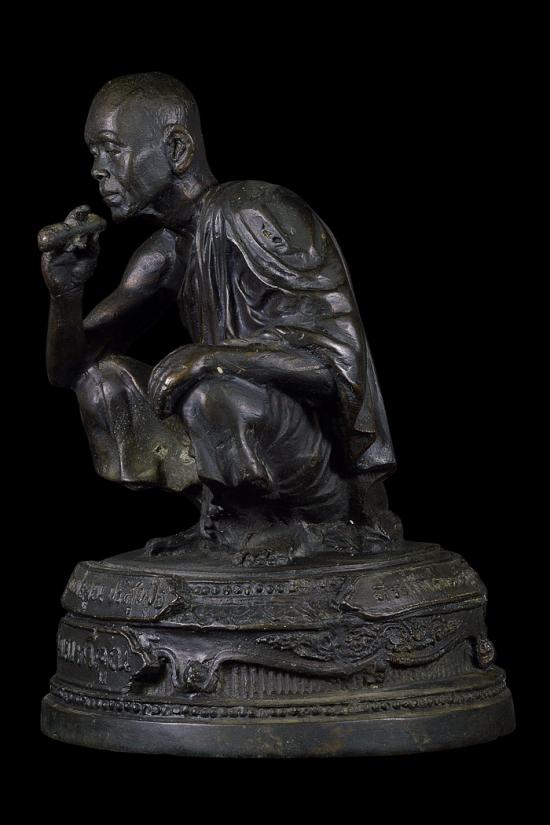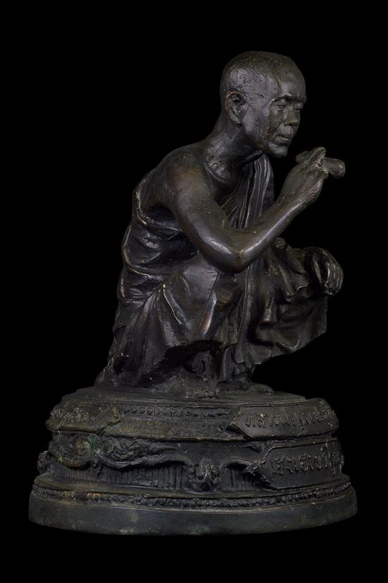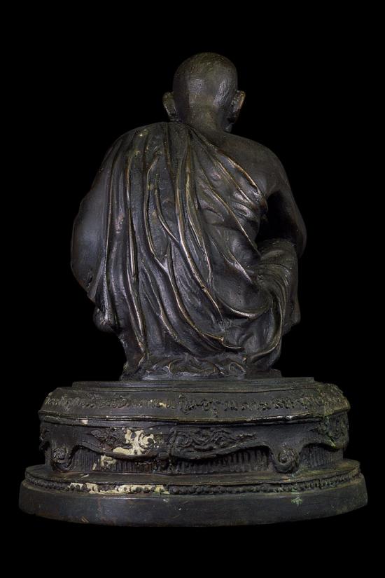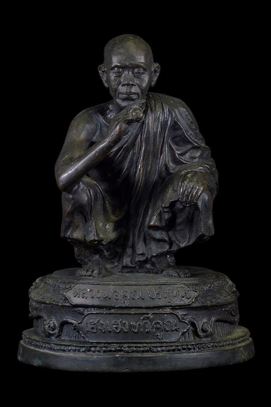 พระบูชารูปเหมือนนั่งยอง ( 5 นิ้ว ) รุ่น เฮงเฮงทวีคูณ ที่ระลึกงานฝังลูกนิมิต วัดเกาะแก้วอรุณคาม ( เนื้อโลหะรมดำ ) พ.ศ. 2537 ( ใต้ฐานเทปูนฝังเหรียญ รุ่น เฮงคูณเฮง ปี36 )