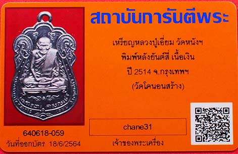 เหรียญหลวงปู่เอี่ยม วัดหนัง พิมพ์หลังยันต์สี่ เนื้อเงิน ปี 2514 (วัดโคนอนสร้าง) พร้อมบัตรรับรองสถาบันการันตีพระ