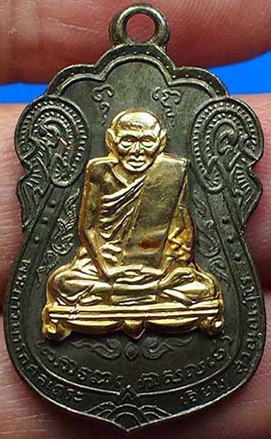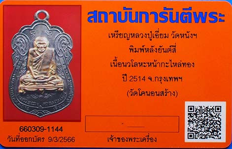 เหรียญหลวงปู่เอี่ยม วัดหนังฯ พิมพ์หลังยันต์สี่ เนื้อนวโลหะหน้ากะไหล่ทอง ปี 2514 จ.กรุงเทพฯ (วัดโคนอนสร้าง) พร้อมบัตรรับรองสถาบันการันตีพระ