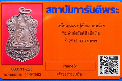 เหรียญหลวงปู่เอี่ยม วัดหนัง พิมพ์หลังยันต์สี่ เนื้อเงิน ปี 2515 จ.กรุงเทพ พร้อมบัตรรับรองสถาบันการันตีพระ