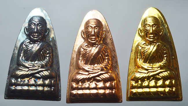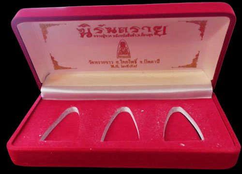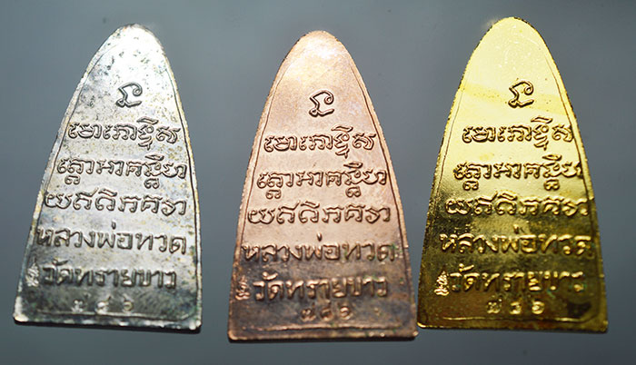 นิรันตราย 2558 หลวงปู่ทวด เตารีเปั๊ม พิมพ์ใหญ่ กรรมการ กะหลั่ยทอง กะหลั่ยเงิน (กลับดำ) กะหลั่ยนาค เลขชุด 786 หลังหนังสือ วัดทรายขาว ปัตตานี กล่องกำมะหยี่ รับ 3 องค์