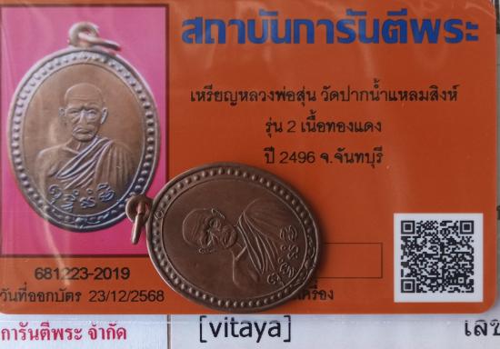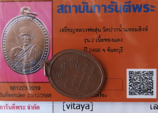 เคาะเดียวแดง++เหรียญหลวงพ่อสุ่น วัดปากน้ำแหลมสิงห์ รุ่น 2 เนื้อทองแดง ปี 2496 จ.จันทบุรี พร้อมบัตรรับรองพระแท้