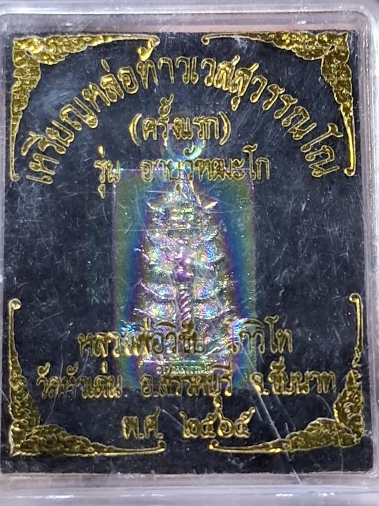เหรียญหล่อท้าวเวสสุวรรณ (ครั้งแรก) หลวงพ่อวิชัย วัดหัวเด่น จ.ชัยนาท เนื้อมหาชนวนผิวไทเทเนียม กล่องเดิม |