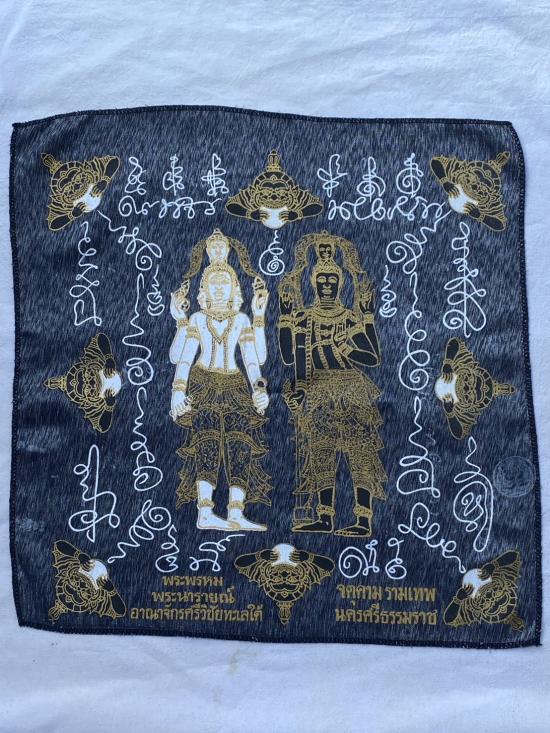 เคาะเดียวแดง ผ้ายันต์ พระพรหม พระนารายณ์ มิ่งมงคล รุ่นมงคลจักวาล ขนาด40/40ซม สีดำ มีตราประทับ-มีรันเลข |