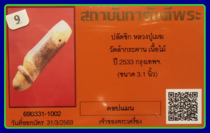 บัตรการันตี -600-ปลัดขิก หลวงปู่เมฆ วัดลำกระดาน กทม. ขนาด3.1นิ้ว |