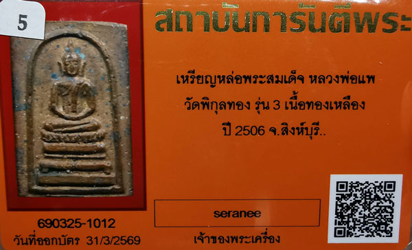 เหรียญหล่อพระสมเด็จหลวงพ่อแพ วัดพิกุลทอง รุ่น3 เนื้อทองเหลือง ปี2506 + บัตรG-pra สภาพเดิมค่ะ