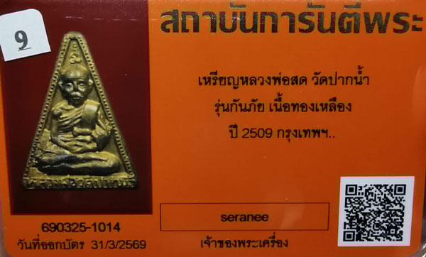 เหรียญหลวงพ่อสด วัดปากน้ำ รุ่นกันภัย เนื้อทองเหลือง ปี2509 จ.กรุงเทพฯ + บัตรG-pra สภาพเดิมค่ะ