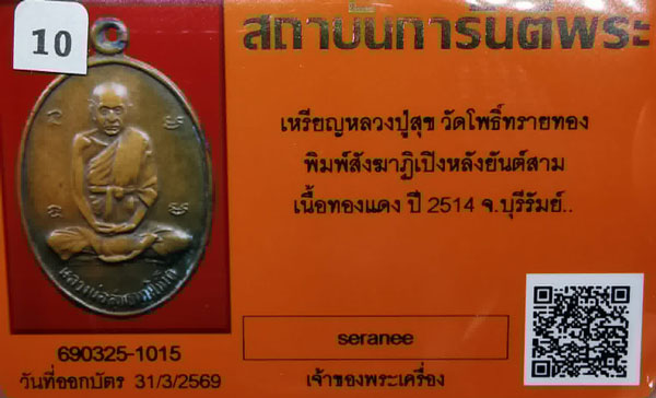 เหรียญหลวงปู่สุข วัดโพธิ์ทรายทอง พิมพ์สังฆาฏิเปิงหลังยันต์สาม เนื้อทองแดง ปี2514 จ.บุรีรัมย์ + บัตรG-pra สภาพเดิมค่ะ