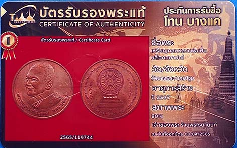 เหรียญกลม หลวงพ่อเปิ่น บล็อคกษาปณ์ เนื้อทองแดง วัดบางพระ ปี 2537 จ.นครปฐม พร้อมบัตรรับรอง