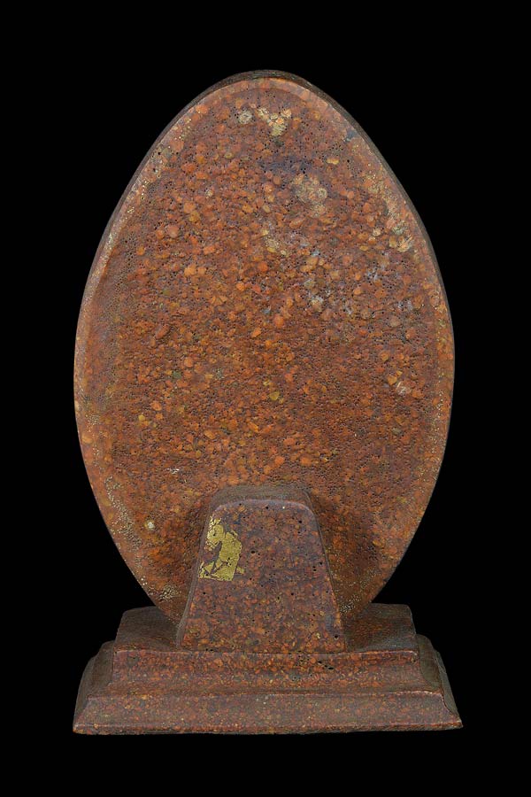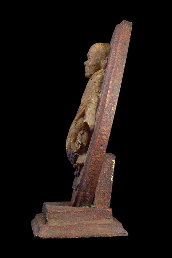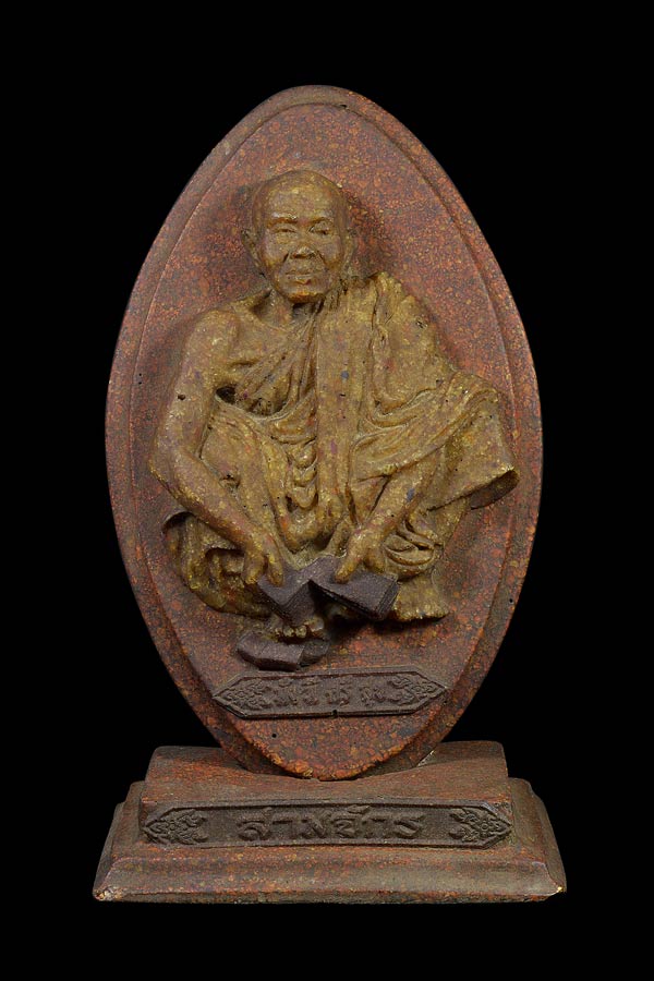 พระบูชาโล่ตั้งโต๊ะรูปเหมือนนั่งยองแจกแบงค์ ( ฐาน 4 นิ้ว x 3 นิ้ว , สูง 7.5 นิ้ว ) มั่ง มี ศรี สุข ร้านสามจักร จัดสร้างแจกให้ลูกค้า ( เนื้อซิลิก้ากระเบื้อง ) ไม่ทราบปีสร้าง ** 2 **