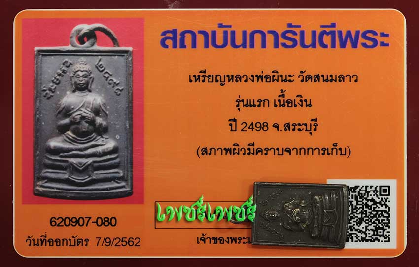 เหรียญ หลวงพ่อผินะ วัดสนมลาว รุ่นแรก เนื้อเงิน ปี2498 จ.สระบุรี สภาพสวย คมชัดเก็บเก่าไม่ผ่านการใช้ พร้อมบัตรรับรองพระแท้จากการันตีพระสบายใจได้พระแท้แน่นอน ค่ะ