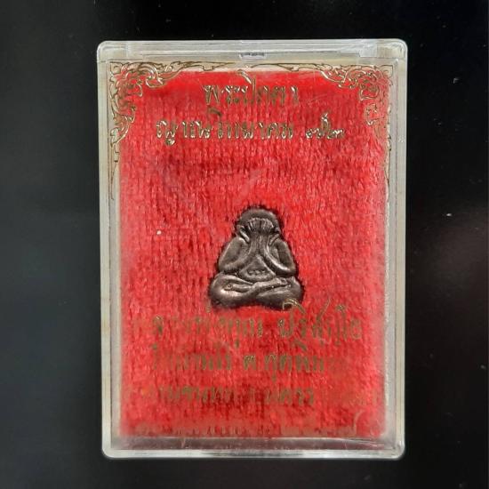 พระปิดตาหลังรูปเหมือน หลวงพ่อคูณ ปริสุทโธ รุ่นญาณวิทยาคม72 เนื้อนวโลหะ ตอกโค๊ต ปี2537 จำนวนสร้าง 999 องค์ สภาพสวยผิวเดิม ไม่มีการล้างผิวใดๆ พร้อมกล่องเดิมวัด