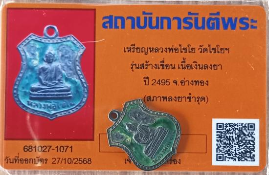 เคาะเดียวแดง+++เหรียญหลวงพ่อไชโย วัดไชโยฯ รุ่นสร้างเขื่อน เนื้อเงินลงยาปี 2495 จ.อ่างทองพร้อมบัตรรับรองพระแท้ (สภาพลงยาชำรุด)