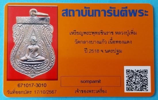 เหรียญพระพุทธชินราช หลวงปู่เพิ่ม วัดกลางบางแก้ว ปี 2518เนื้อทองแดง มีใบรับรองพระแท้จากทางเวป