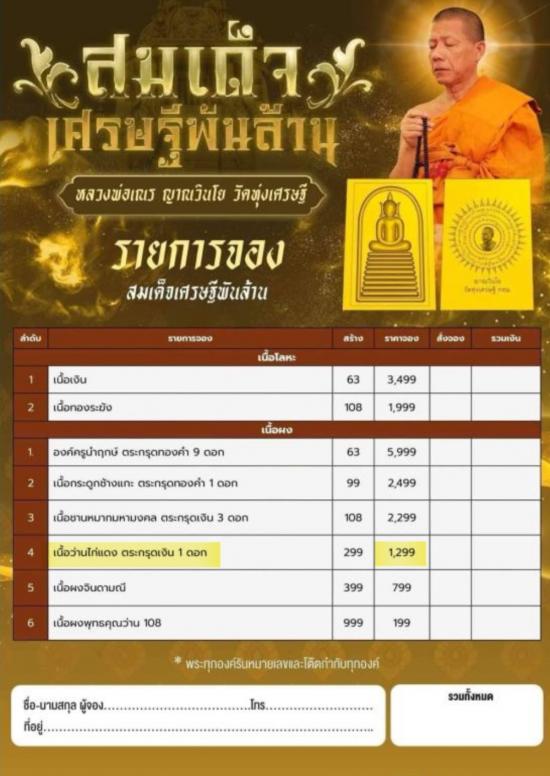 สมเด็จเศรษฐีพันล้าน หลวงพ่อเณร ญาณวินโย วัด ทุ่งเศรษฐี หมายเลข 16 (เลขโซนวันเกิด) รายการจองที่ 4 เนื้อว่านไก่แดง ตะกรุดเงิน 1 ดอก |