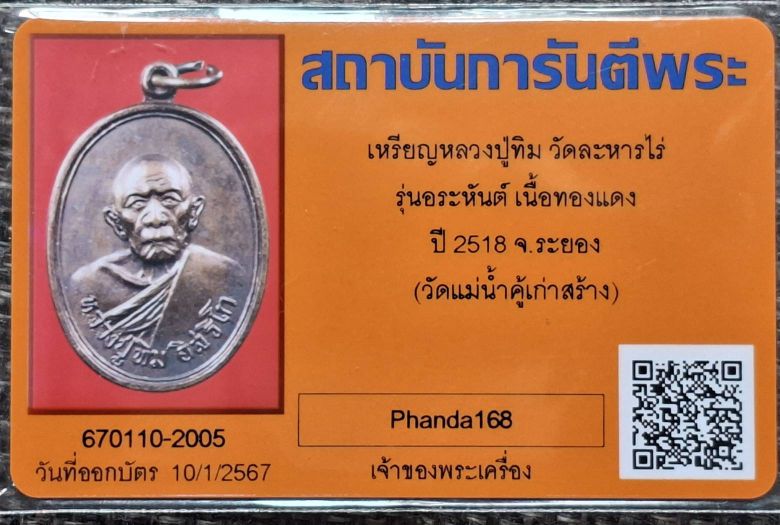 เหรียญหลวงปู่ทิม วัดละหารไร่ รุ่นอระหันต์ เนื้อทองแดง ปี2518 จ.ระยอง วัดแม่น้ำคู้เก่าสร้าง เหรียญสภาพผิวไฟแดง สวยๆ ผิวเดิม พร้อมบัตร***พิจารณาตามภาพประกอบ***