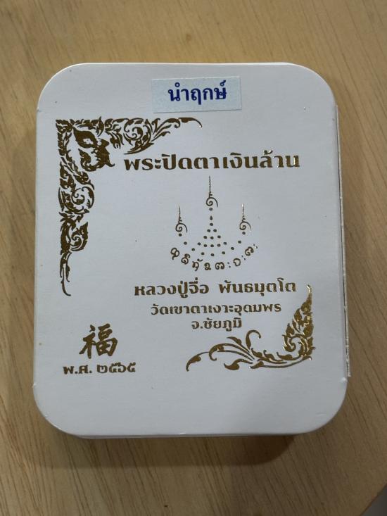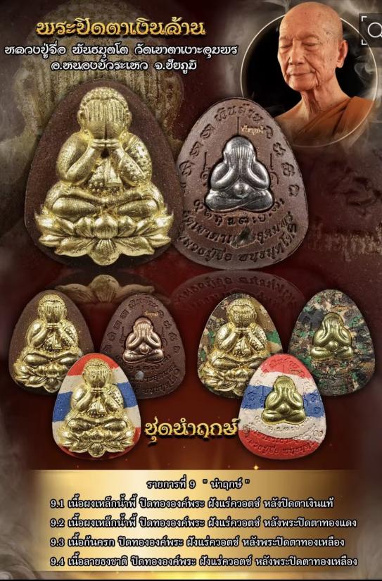 พระปิดตาเงินล้าน หลวงปู่จื่อ ชุดนำฤกษ์ เนื้อลายธงชาติ ปิดทององค์พระ ฝังแร่ควอตซ์ หลังพระปิดตาทองเหลือง |