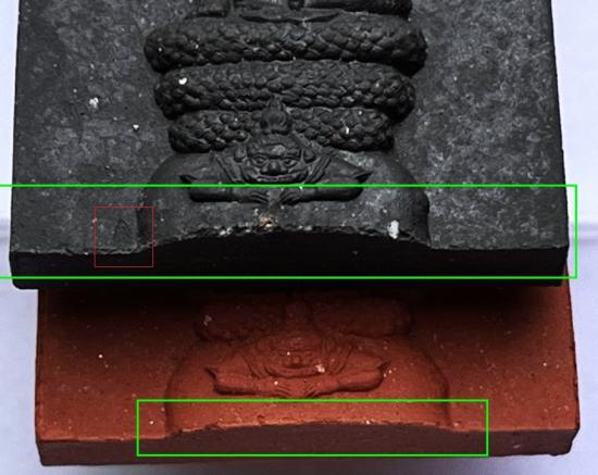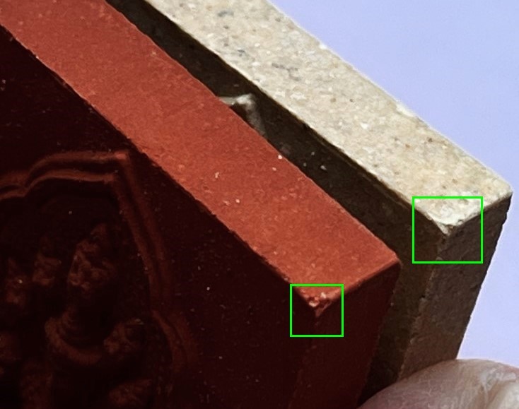 - เนื้อดำ+แดง มีตำหนิขอบล่าง + กระเทาะขอบซ้าย ตามภาพด้านล่าง
