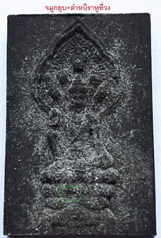 - เนื้อดำ ด้านหน้าเป็นคราบขุยทั่วองค์ + ตำหนิด้านบนราหูที่วง