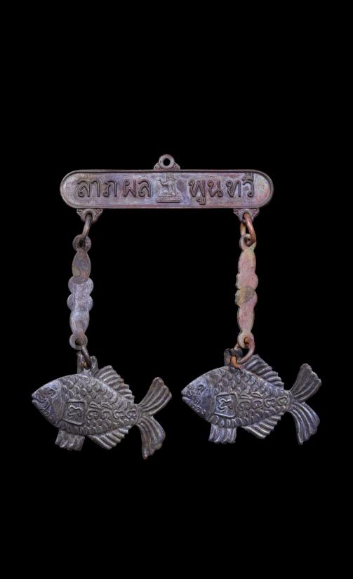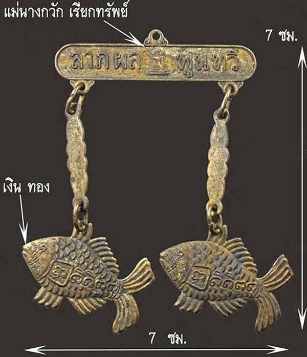 ปลาตะเพียนคู่เงิน- ทอง พร้อมตุ้งติ้งนางกวัก ลาภผลพูนทวี หลวงพ่อเต๋ คงทอง วัดสามง่าม ปี ๒๕๑๑ ขนาดกว้าง 2.5 ซม. ยาว 3.5 ซม. สภาพเดิมๆ เก่าเก็บ สวย แบบนี้หายากแล้วครับ บูชาเน้นเมตตาค้าขาย โภคทรัพย์ดีมากค |
