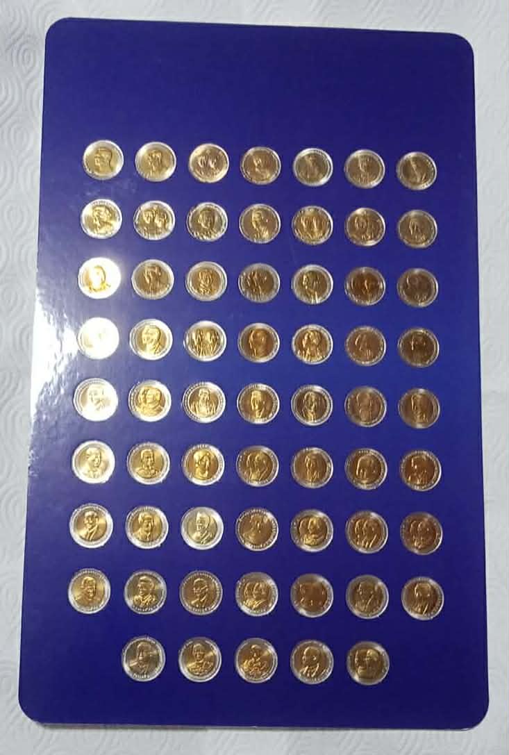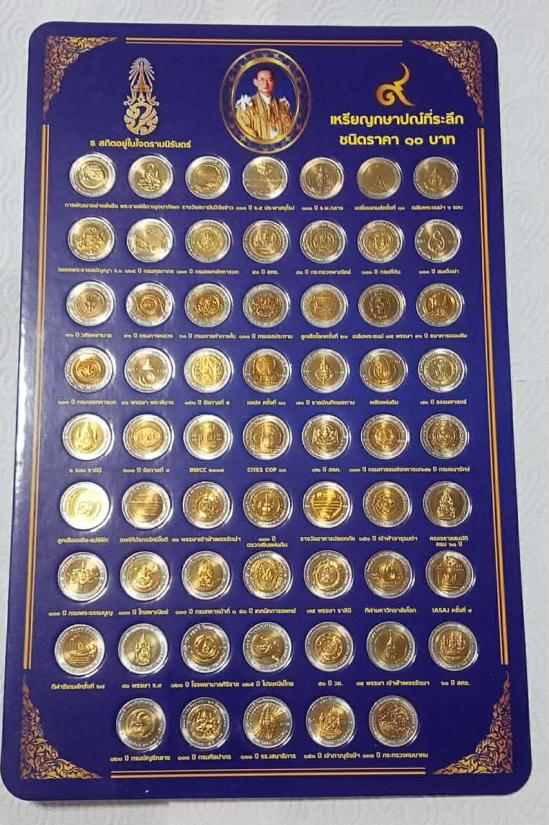 เหรียญ 10 บาท สองสี ในสมัยรัชกาลที่ 9 ครบทุกวาระ 61วาระ เหรียญสภาพไม่ผ่านการใช้งาน UNC พร้อมแผงสีน้ำเงิน จำนวน 1 แผง ครับ