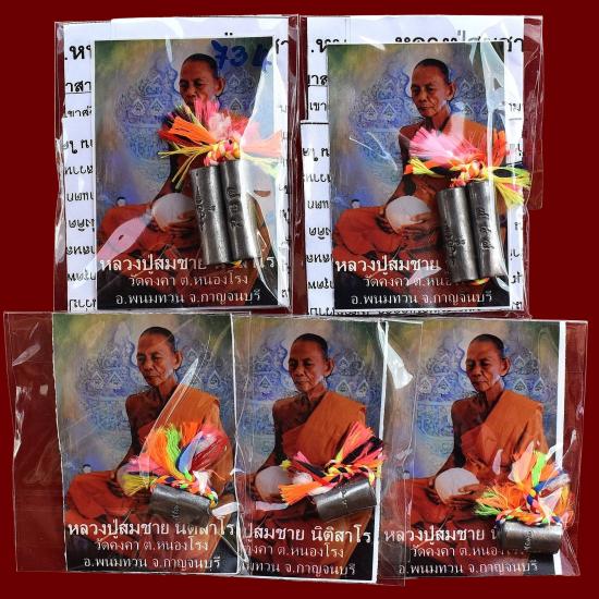 ชุด 5 ดอก...ตะกรุดสาลิกาหาคู่ ร้อยเชือกเจ็ดสี เบอร์ ๗๓๔ + ๗๘๗ ปี 2555 + ตะกรุดพิศมรคลอนใจ ร้อยเชือกเจ็ดสี ปี 2556 หลวงปู่สมชาย วัดคงคา จ.กาญจนบุรี พร้อมซองเดิมจากวัด สภาพพระตามรูปที่ลงทุกประการ (ตะกรุดสาลิกาหาคู่ ขนาดยาวประมาณ 1 นิ้ว) + (ตะกรุดพิศมรคลอนใจ ขนาดประมาณ 1.5 ซม.)