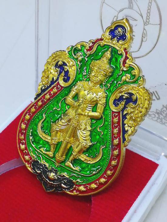 เหรียญ ท้าวเวสสุวรรณ ไพศรพณ์ สยบไพรี หลวงพ่อพัฒน์ ปุญญากาโม วัดห้วยด้วน จ.นครสวรรค์ (ขนาดเหรียญสูง 4.5 ซม.) เนื้อทองทิพย์ ลงยาสีเขียว สร้าง 160 เหรียญ หมายเลข 101