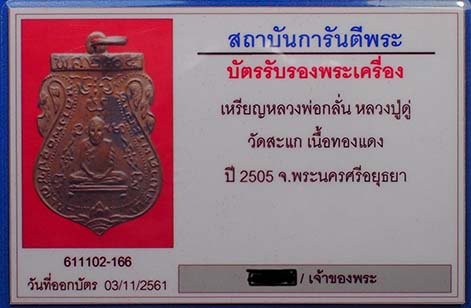 เหรียญหลวงพ่อกลั่น หลวงปู่ดู่ วัดสะแก เนื้อทองแดง ปี 2505 จ.พระนครศรีอยุธยา พร้อมบัตรรับรองสถาบันการันตีพระ