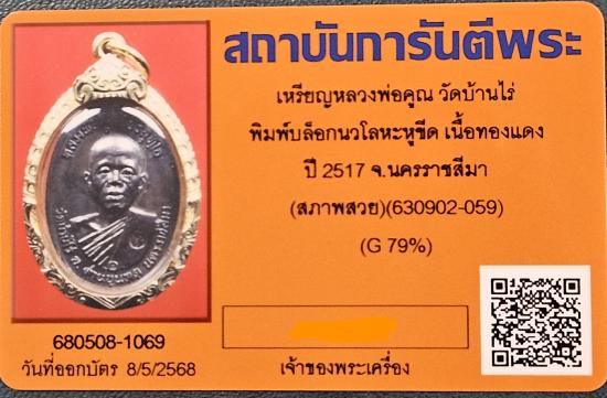 เหรียญหลวงพ่อคูณ วัดบ้านไร่ บล็อกนวโลหะ หูขีด เนื้อทองแดง + บัตรสภาพสวย + เลี่ยมทอง % สูง