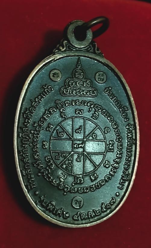 ด้านหลังเหรียญตรงกลางเป็นอักขระยันต์ มีข้อความล้อมรอบว่า ที่ระลึกสร้างกุฎิสงฆ์วัดสระแก้ว อำเภอเมือง จังหวัดนครราชสีมา รุ่นพิเศษ ๔ ต.ค.๒๕๑๗