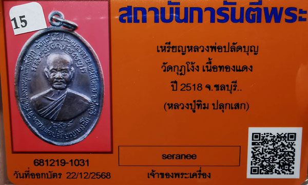 เหรียญหลวงพ่อปลัดบุญ วัดกุฏโง้ง จ.ชลบุรี เนื้อทองแดง บล็อก ด.ขีด นิยม ห่วงเดิม ปี 2519 หลวงปู่ทิม วัดละหารไร่ ปลุกเสก สวยๆ พร้อมบัตร