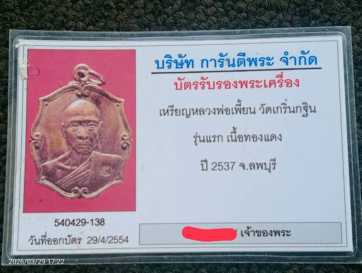 เหรียญหลวงพ่อเพี้ยน รุ่นแรก ปี 2537 วัดเกริ่นกฐิน จ.ลพบุรี