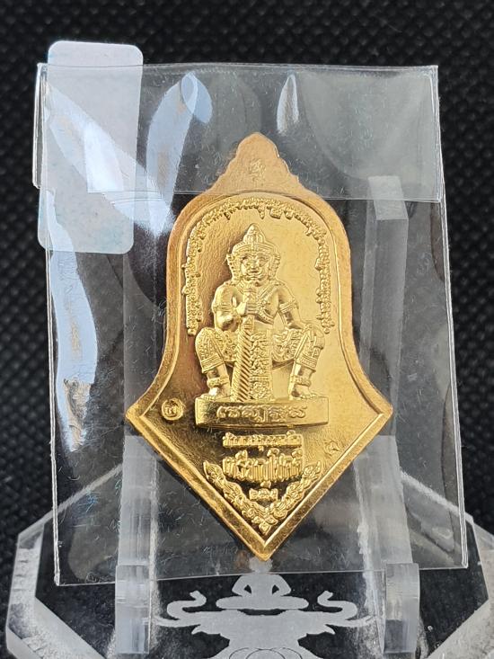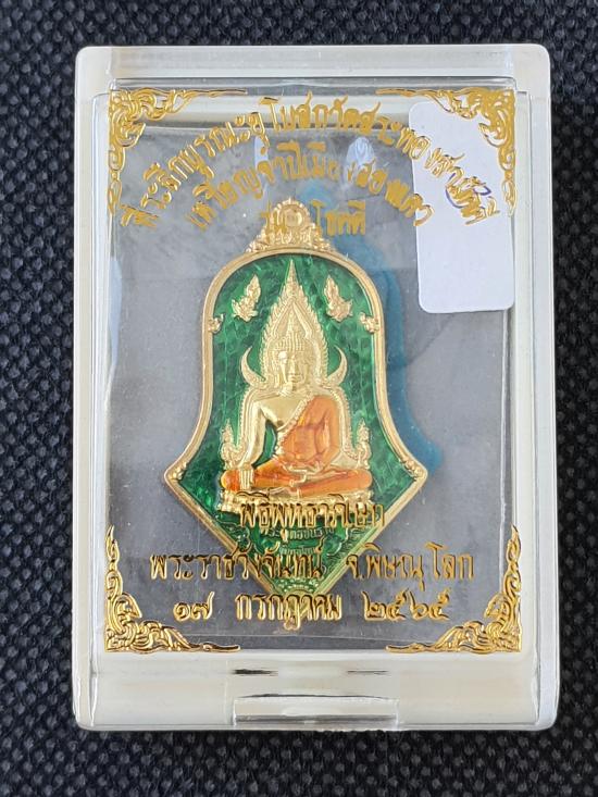 เหรียญทรงจำปี พระพุทธชินราชประทับหลังท้าวเวสสุวรรณ เนื้อกะไหล่ทองลงยาสีเขียว ปี 2565 รุ่นโชคดี แยกชุดกรรมการ หมายเลข 3 เลขสวย พร้อมกล่องครบ