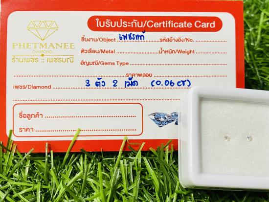 เพชรแท้ธรรมชาติ เหลี่ยมเบลเยี่ยมคัต แกะจากตัวเรือนสินหลุดจำนำ สภาพสมบูรณ์ น้ำหนัก 0.06 กะรัต (3 ตัง 2 เม็ด) น้ำประมาณ ~97-98VS1-VVS |